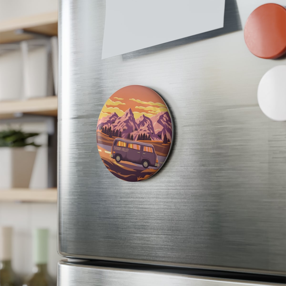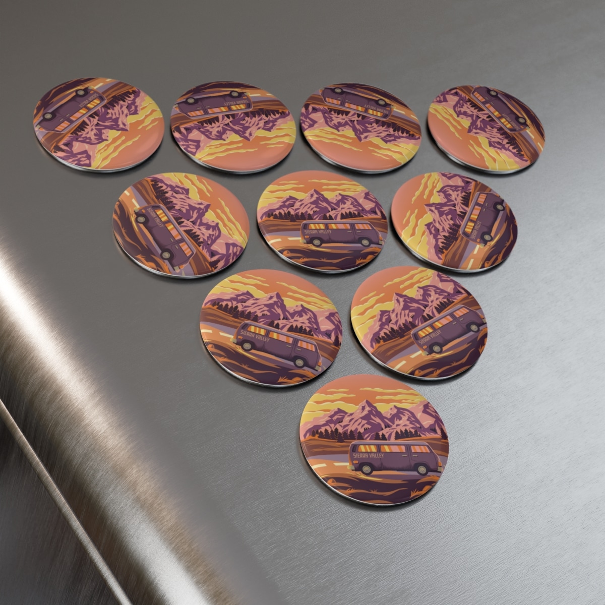 Add a touch of Sierra Valley to your fridge with this 2.25″x5.7cm button magnet! Available as 1-packs or 10-packs, these round magnets feature a metal shell front with a magnetic backing. On the front you’ll find a clear mylar/UV cover that protects the design against fading and scratches